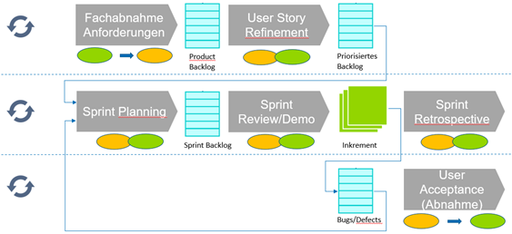 Die in den Workshops erarbeiteten Inhalte flossen in die Guideline ein. Als agile Vorgehensweise wurde, entsprechend HERMES 5.1, das Scrum Framework ausgewählt. Die Anwendungsfälle mit den relevanten Rollen werden in der Guideline beschrieben und bilden den Kern der Guideline. Eine gemäss HERMES strukturierte Rollenbeschreibung wurde für jede Rolle beigefügt. Wichtige andere Themen umfassen die Kultur der agilen Zusammenarbeit, das Scrum Framework und die Klärung der Zusammenarbeit bei Events zur Übergabe, welche im folgenden Diagramm dargestellt sind.