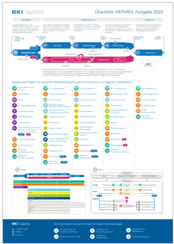 Das ideale Hilfsmittel für die Prüfungsvorbereitung zur HERMES Zertifizierung. Alle Phasen, Module, Aufgaben, Ergebnisse und Rollen zusammengefasst.